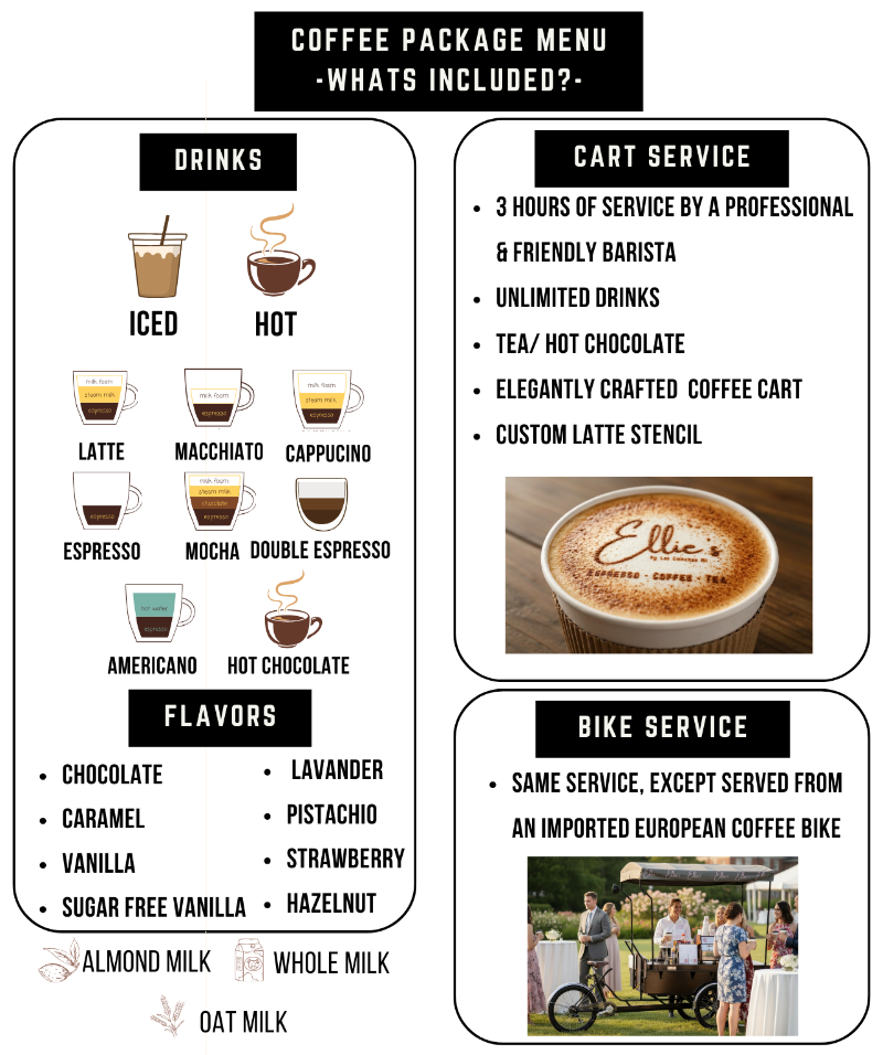 - We are proud to display our authentic imported Italian commercial espresso machines on our carts (many of our competitors hide their machines) - no home-use breville or nespresso machines will ever be found on an Ellie's Cart. We provide the highest quality Service, Coffee, Equipment & Carts ensuring your coffee is served at a high speed, with high quality.
